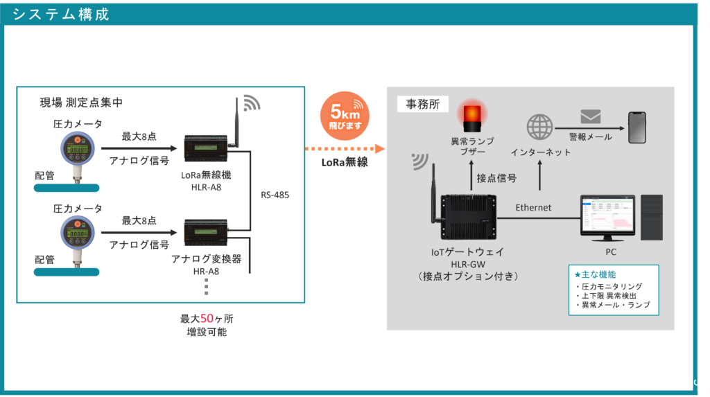 LoRa無線機組合せることで圧力監視を配線工事レスで一元管理!